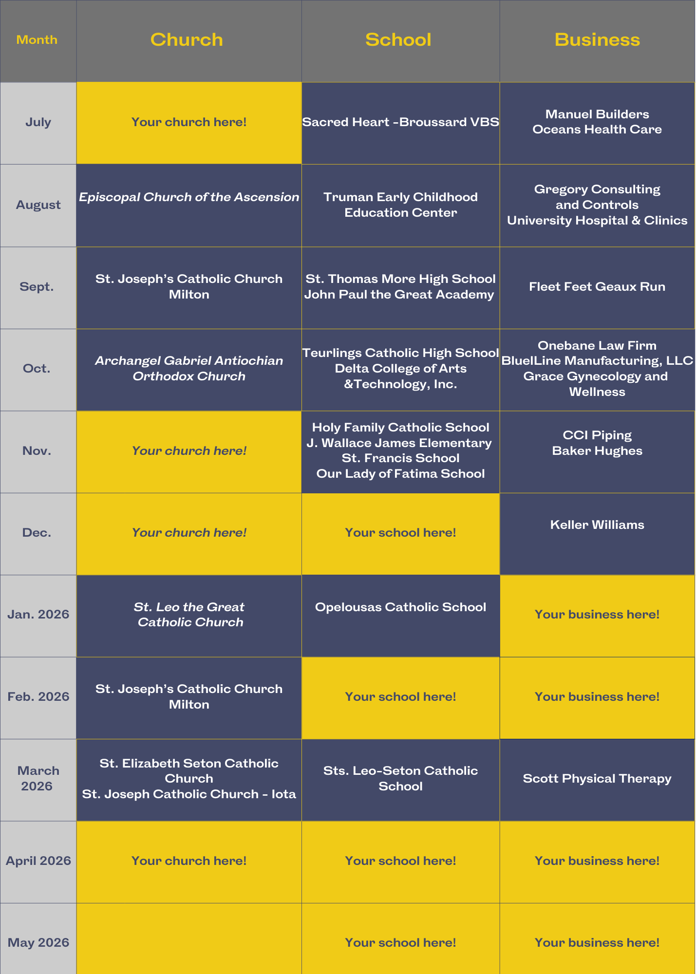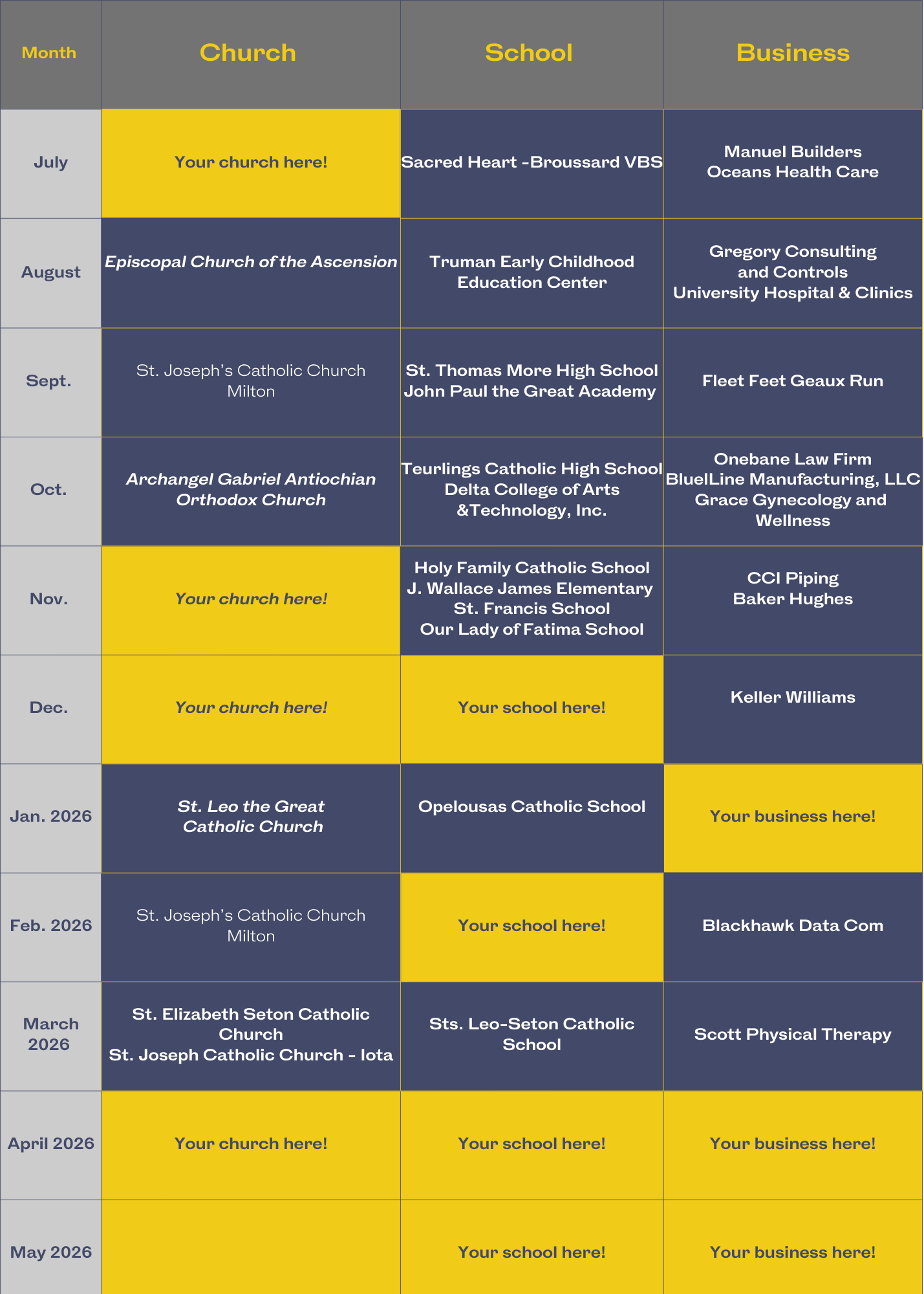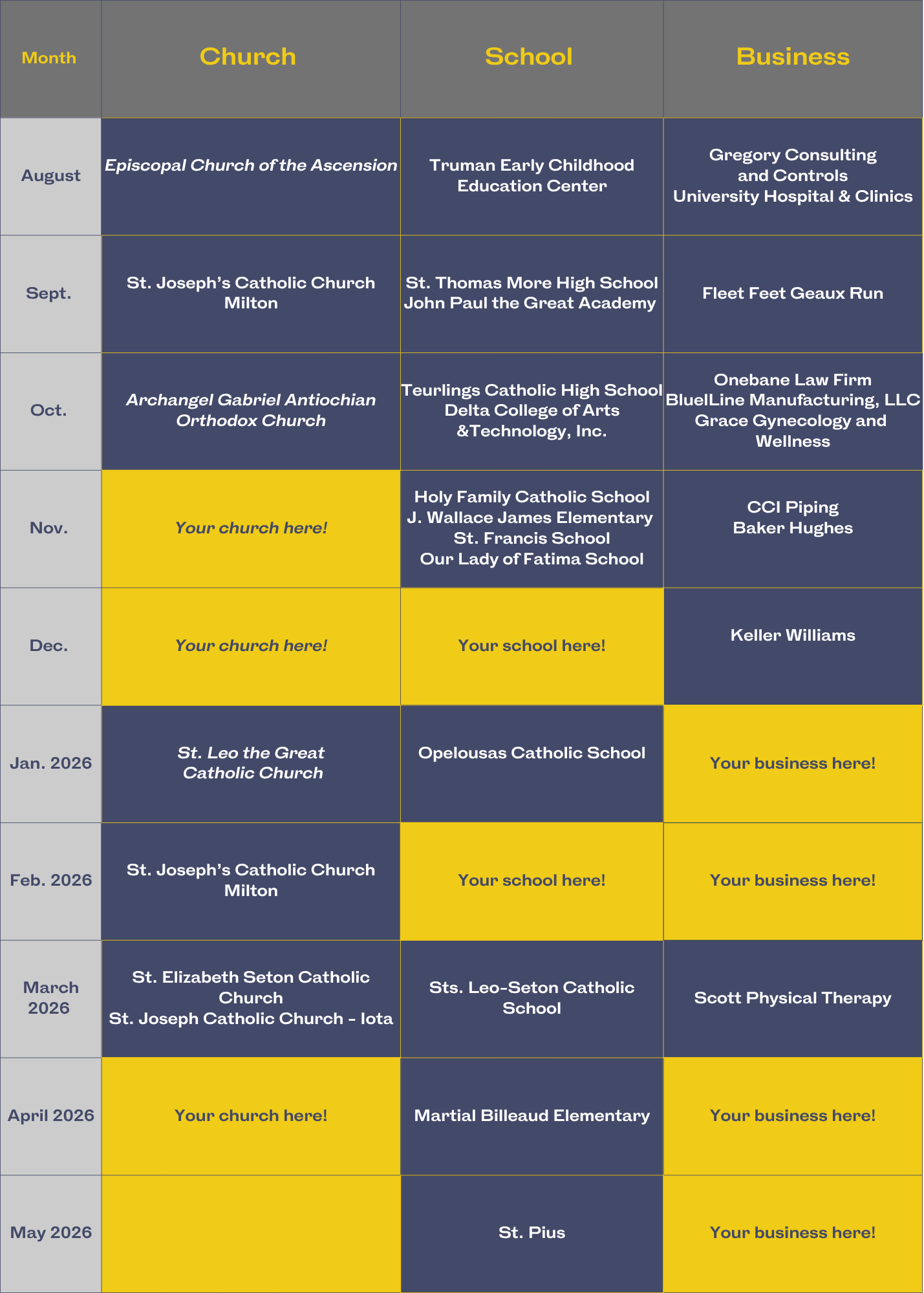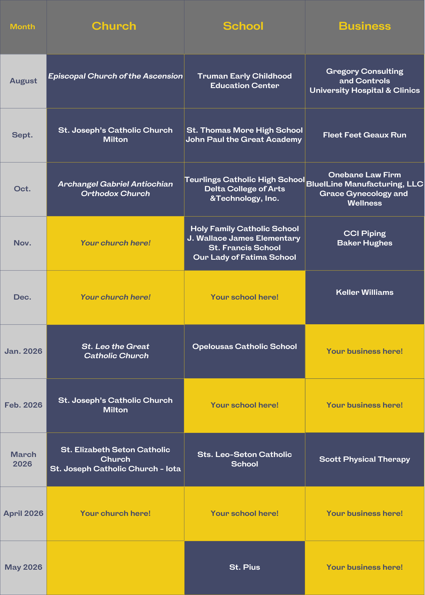 To inquire or sign up, contact Donations Coordinator, Matthew Lavergne at matthew@catholiccharitiesacadiana.org 337-235-4972 ext. 1230
