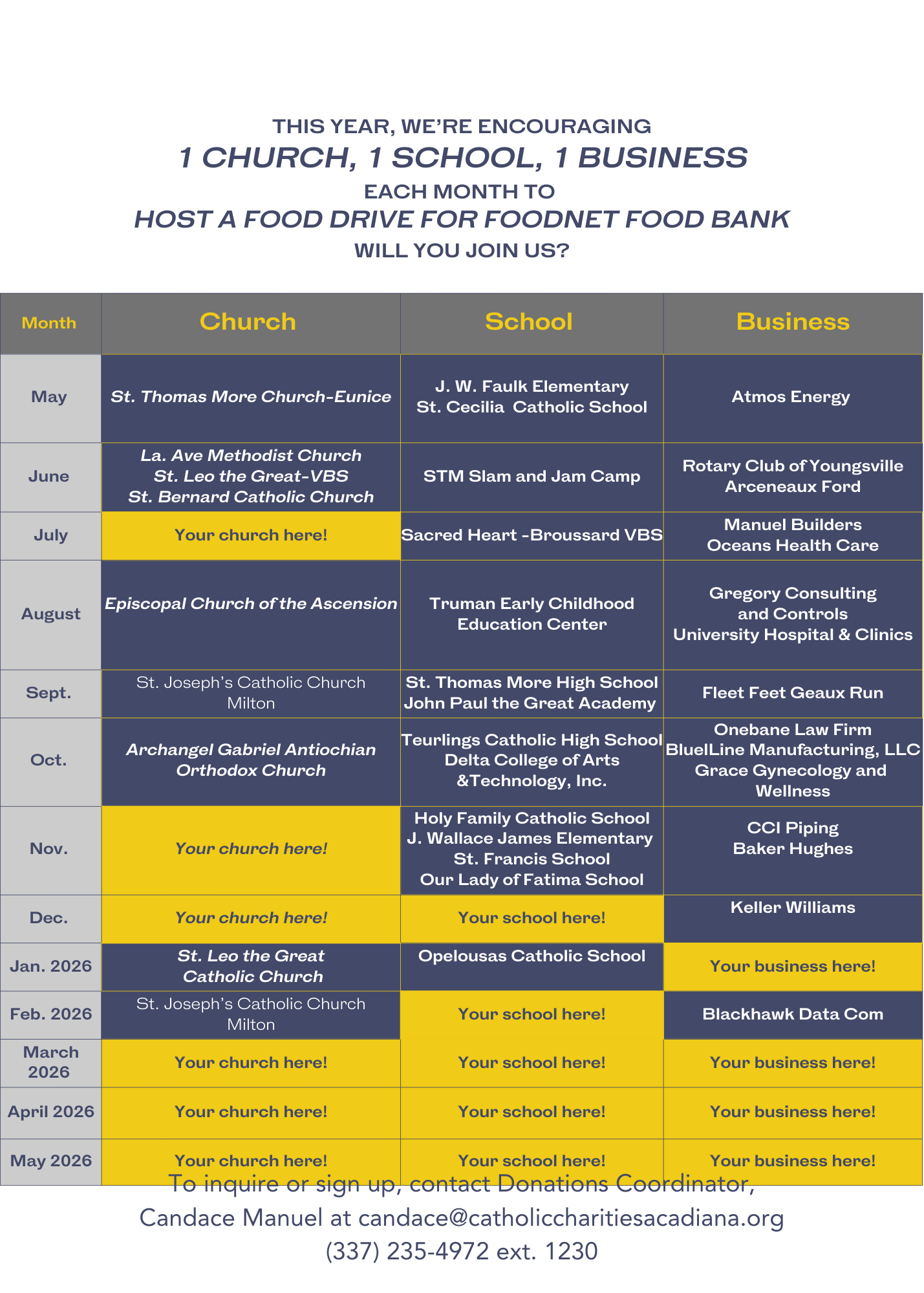 This effort is critical to ensure that more families are cared for in our community. Without adequate and appropriate canned good donations, Catholic Charities of Acadiana spends $7,000-$8,000 each week filling the supplemental food bags we distribute.